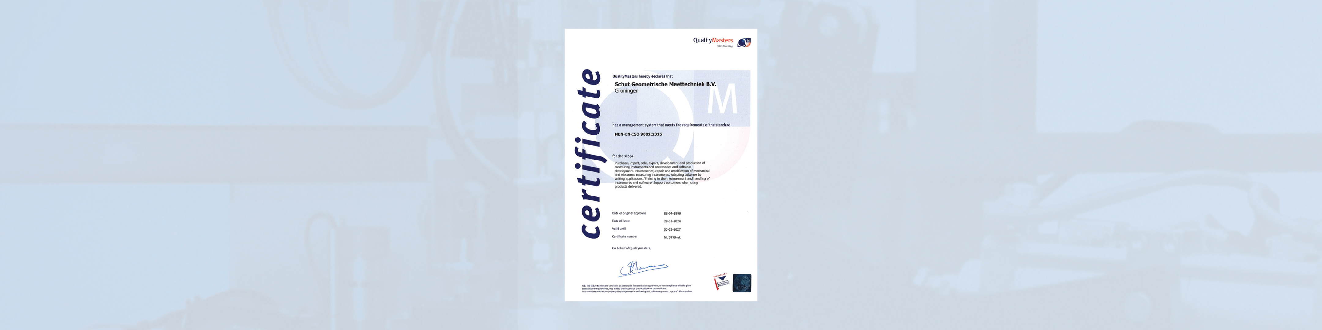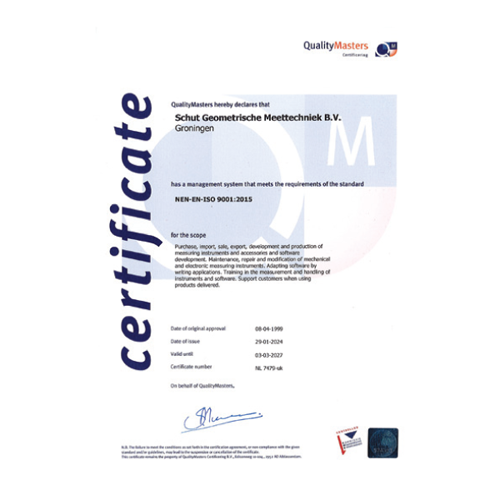 Schut Geometrische Meettechniek BV Groningen, Niederlande wurde von Quality Masters BV in Bezug auf ihr Qualitätsmanagement-System bewertet und befunden zu erfüllen: NEN-EN-ISO 9001: 2015.