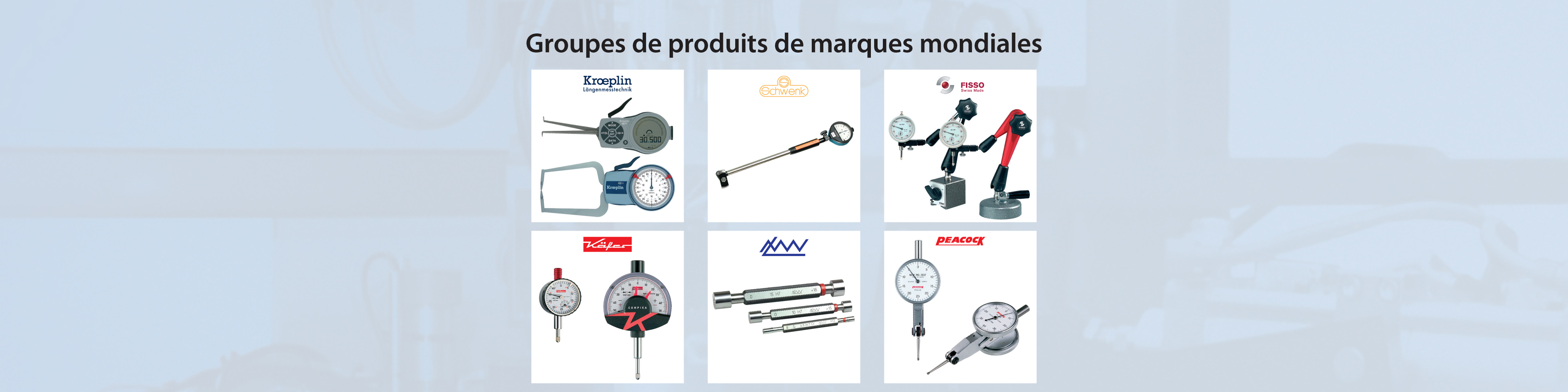 Une grande variété des produits de qualité des grands fabricants comme Fisso (supports de comparateur), Käfer et Peacock (comparateurs), LMW (jauges), Martin + Tschopp (piges de contrôle), Schwenk et Krœplin (mesureurs d’intérieur et d’extérieur) et Helios-Preisser et DEMM (instruments de mesure).